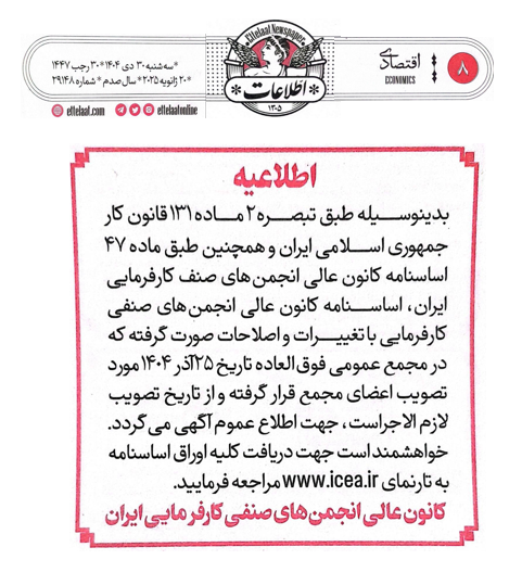 با عنایت به ماده ۴۷ و تبصره ۲ ماده ۱۴ اساسنامه مصوب ۲۵ آذر ماه ۱۴۰۴ ، به اطلاع میرساند که آخرین تغییرات اساسنامه که در تاریخ فوق مصوب گردیده است در سایتwww.icea.ir جهت اطلاع اعضاء عمومی بارگذاری گردیده است . اعضای محترم میتوانند فایل pdf اساسنامه را نیز از طریق سایت فوق دریافت نمایند . در ضمن طبق تبصره ۲ و ۳ ماده ۱۶ اساسنامه، از تاریخ ابلاغ مصوبات مجمع عمومی فوق العاده به شرح بالا توسط هیئت رئیسه اساسنامه لازم الاجرا میباشد. ضمناً آگهی موضوع تغییرات و اصلاح اساسنامه در تاریخ 1404.10.30 در صفحه 8 روزنامه اطلاعات به شماره 29148 ( به شرح پیوست ) آگهی و چاپ و انتشار یافته است. امید داریم با شرایط موجود بتوانیم در کنار همدیگر به اهداف بلند کانون عالی کارفرمایی ایران دست یابیم. قبلاً از بذل عنایتی که میفرمایید سپاسگزاری مینماید.